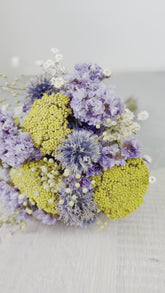 Our No1 Grande Bouquet incorporates Achillea Parker, Statice Sinuata, Echinops, Lepidium Atraxa, and Glixia.